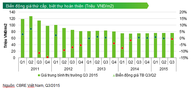 Đối với phân khúc biệt thự, liền kề quý III/2015 ghi nhận nhiều dự án mở bán mới bao gồm Evelyne Garden (Park City Giai đoạn 2, CĐT Perdana), Starlake (Tây Hồ Tây, CĐT Daewoo E&C), Khu Ngoại giao đoàn (CĐT Cty Xây dựng Hà Nội), Aquabay Ecopark (CĐT Vihajico) và Gamuda Giai đoạn 2 (CĐT Gamuda Land). Các dự án này đã bổ sung 1.000 căn nhà, lô đất mới cho phân khúc biệt thự, liền kề. Đây đều là các dự án nằm tại khu vực dân cư phát triển nhanh, do có kết cấu hạ tầng được cải thiện. Thêm vào đó, các sản phẩm nhà ở đang trở nên đa dạng hơn với việc tập trung vào sản phẩm nhà phố. Tuy nhiên, theo đánh giá của Công ty tư vấn Bất động sản CBRE, nếu được quản lý phù hợp, các sản phẩm nhà ở giá trị cao này có thể mang lại cơ hội đầu tư tiềm năng cho khách hàng bên cạnh giá trị sinh sống.