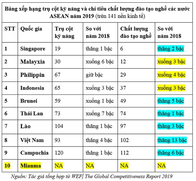 Với nhóm kỹ năng của lực lượng lao động hiện thời, Báo cáo đánh giá Việt Nam xếp thứ 103/141 quốc gia, thăng 8 bậc so với năm 2018. Trong đó, chất lượng đào tạo nghề nghiệp được chấm 44/100 điểm (tăng 3 điểm), và xếp thứ 102/141 quốc gia, tăng 13 bậc. Đây là mức tăng xếp hạng cao nhất trong các quốc gia ASEN.