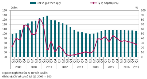Trong khi đó, quý I/2017, chỉ số hoạt động văn phòng đạt mức 63 điểm, tăng 1,5 điểm theo quý và 5,2 điểm theo năm chủ yếu nhờ công suất thuê toàn thị trường tăng 0,7 điểm % theo quý và 5,0 điểm % theo năm.