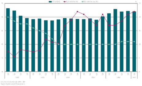 Tại TP. Hồ Chí Minh, trong năm 2016, chỉ số giá nhà ở tăng đáng kể do có nhiều dự án trung và cao cấp gia nhập thị trường trong khoảng thời gian này. Tuy nhiên, tăng trưởng có dấu hiệu chững lại vào quý I/2017 với chỉ số đạt 92 điểm, không đổi theo quý và tăng 1 điểm theo năm (Biểu đồ 2).