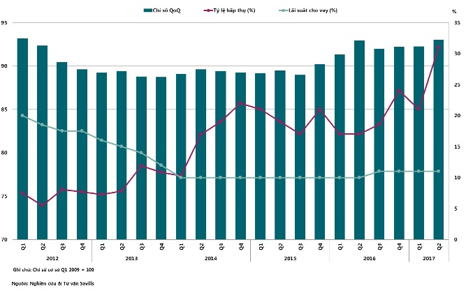 Chỉ số văn phòng tại quý 2/2017 đạt 89 điểm, tăng 2 điểm theo quý và 7 điểm theo năm. Đây là kết quả của giá thuê gia tăng 4% theo quý và 5% theo năm. Với sự gia nhập của 3 dự án mới, công suất trung bình giảm nhẹ 1 điểm phần trăm đến mức 96%.