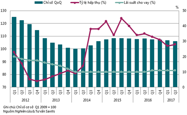 Cụ thể là, tại Hà Nội, trong quý 2/2017, chỉ số giá nhà ở đạt 106,1 điểm, giảm 1 điểm theo quý và 2 điểm theo năm (Biểu đồ 1). Giá bán trung bình ghi nhận ở mức 1.209 USD/m² hay 27,5 triệu đồng/m². Áp lực ngày càng tăng của nguồn cung thứ cấp khiến giá giảm xuống. Giá sơ cấp hạng A cũng giảm xuống do các dự án mới có giá chào bán thấp hơn mức giá trung bình của thị trường.