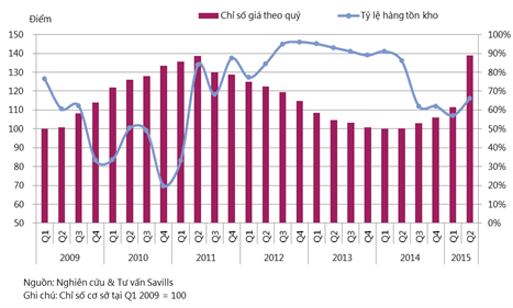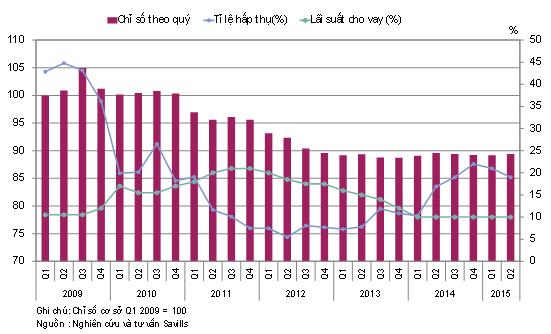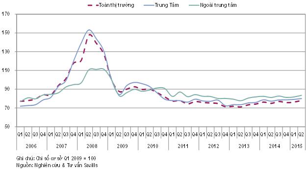 Trong quý II/2015 chỉ số giá nhà ở là 89,4, tăng 0,3 điểm theo quý và ổn định theo năm. Tỷ lệ hấp thụ toàn thị trường là 19%, giảm -2 điểm phần trăm theo quý nhưng tăng 2 điểm phần trăm theo năm. Trong quý II/2015, khoảng 5.000 căn hộ được hấp thụ, tăng 17% theo quý và 96% theo năm. Đây là lượng giao dịch cao nhất kể từ quý IV/2010 (Biểu đồ 3).