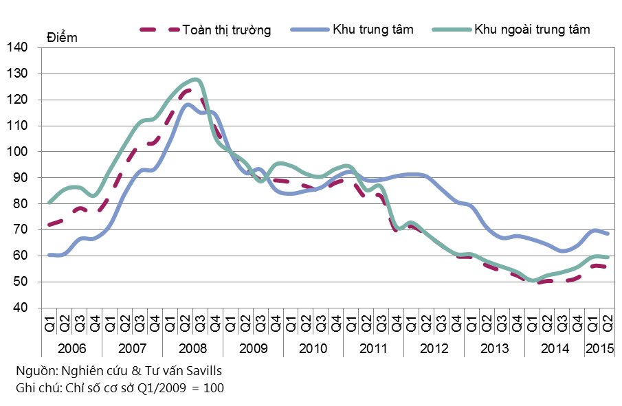 Trong quý II/2015, chỉ số hoạt động văn phòng ở cả khu vực trung tâm và ngoài trung tâm đều giảm trong quý này. Trong khi, chỉ số tại khu vực trung tâm đạt mức 68,6 điểm, giảm 1,0 điểm so với quý trước nhưng tăng 4,2 điểm theo năm, do sự giảm nhẹ về giá và công suất thuê của văn phòng hạng B. Tại khu vực ngoài trung tâm, chỉ số này giảm nhẹ -0,1 điểm theo quý, nhưng tăng 7,0 điểm theo năm đạt mức 59,5 điểm.