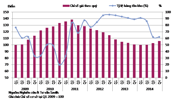 Tại Hà Nội. Trong Q4/2014, chỉ số giá nhà ở đạt mức 106 điểm, tăng 3,2 điểm theo quý và 5,3 điểm theo năm. Chỉ số giá nhà ở theo kỳ ở mức 91 điểm trong Q4/2014, tăng 3,5 điểm so với Q3/2014. Quý này chứng kiến sự tăng lên đáng kể trong cả so sánh theo quý và theo kỳ cơ bản.