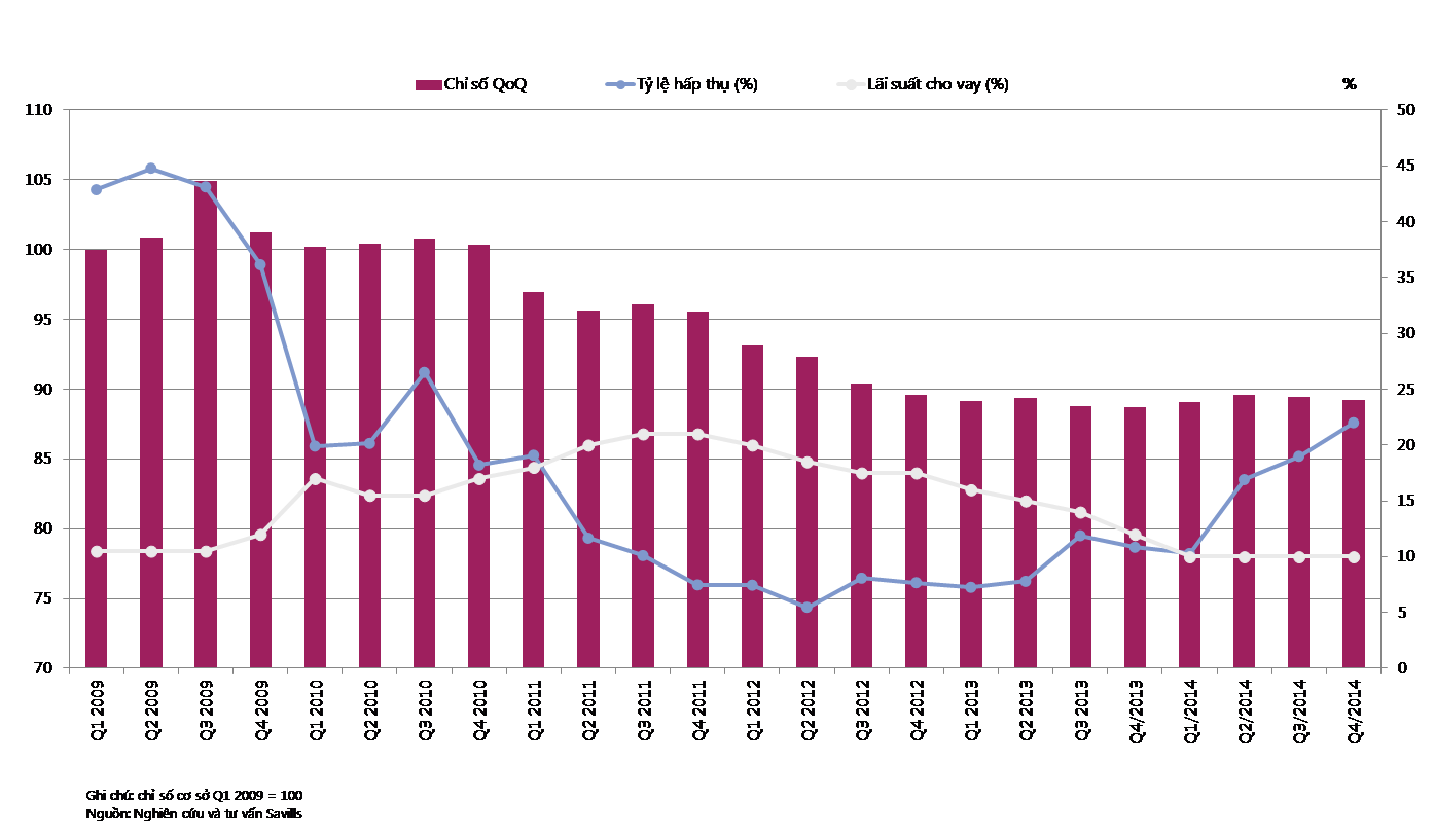 Tại TP. Hồ Chí Minh. Chỉ số giá nhà ở trong Q4/2014 là 89,2, ổn định theo quý và tăng 0,5 điểm theo năm. Tỷ lệ hấp thụ toàn thị trường là 22%, tăng mạnh 3 điểm phần trăm theo quý và 11 điểm phần trăm theo năm. Trong Q4/2014, khoảng 4.130 căn hộ được hấp thụ, tăng 28% theo quý và 149% theo năm. Đây là lượng giao dịch cao nhất kể từ Q4/2010.