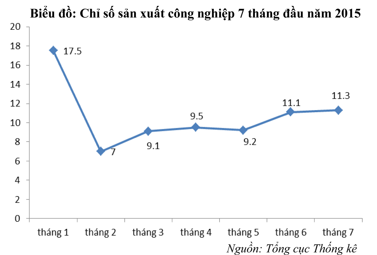 Tính chung 7 tháng đầu năm 2015, IIP tăng 9,9% so với cùng kỳ năm 2014. Trong đó, ngành khai khoáng tăng 9,2%, đóng góp 2 điểm phần trăm vào mức tăng chung; ngành chế biến, chế tạo tăng 10,1%, đóng góp 7 điểm phần trăm; ngành sản xuất, phân phối điện tăng 11,5%, đóng góp 0,8 điểm phần trăm; ngành cung cấp nước và xử lý nước thải, rác thải tăng 7,1%, đóng góp 0,1 điểm phần trăm.
