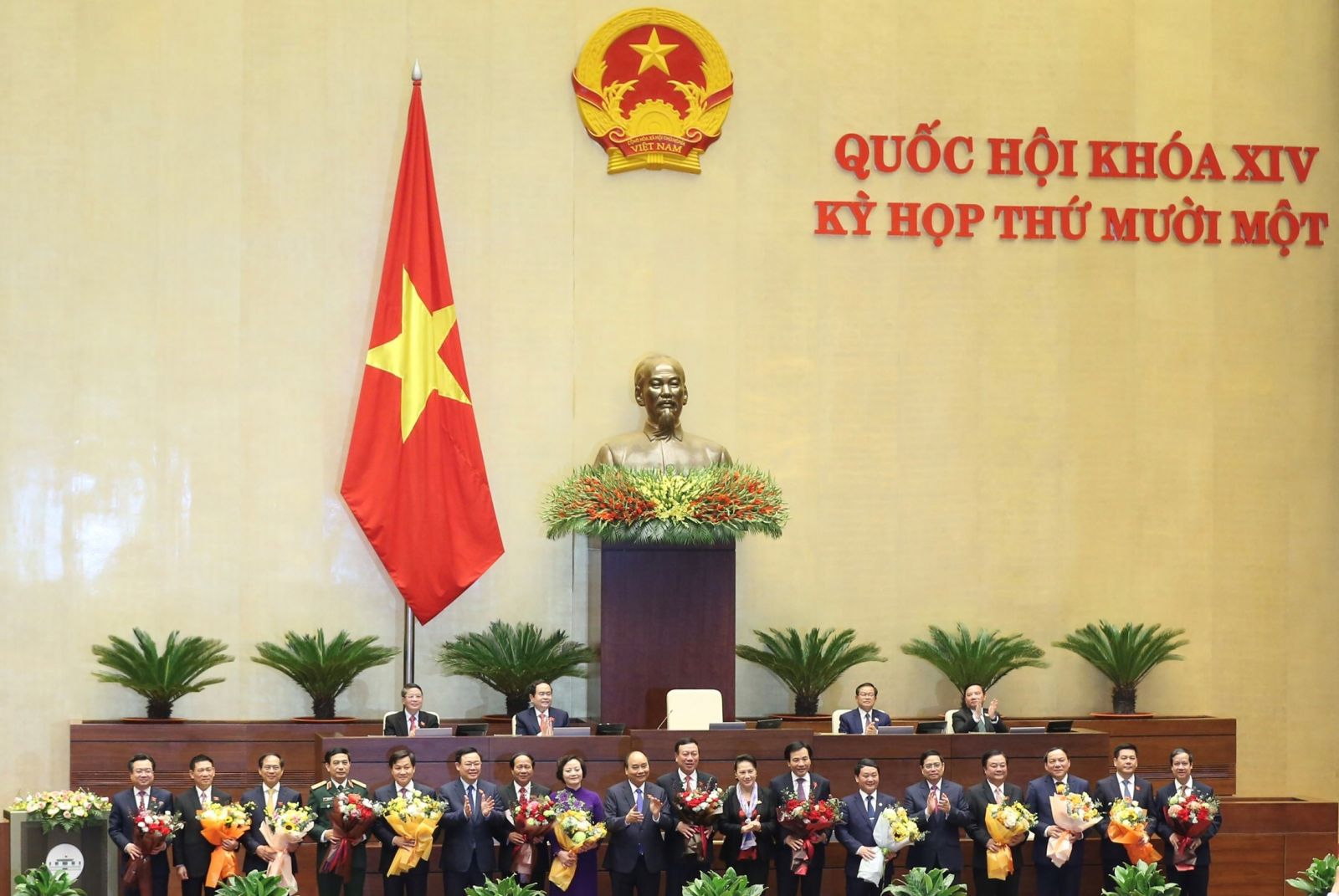 Chủ tịch Quốc hội Vương Đình Huệ, Chủ tịch nước Nguyễn Xuân Phúc và Thủ tướng Phạm Minh Chính chúc mừng các tân Phó Thủ tướng và 12 bộ trưởng, thành viên Chính phủ mới. Ảnh: VGP