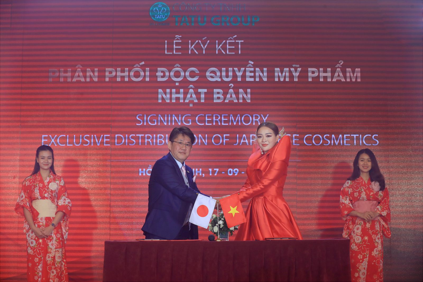Đại diện nhà máy sản xuất Nhật Bản – ông Suzuki Motohiro và CeoTatu Group – Á hậu Doanh Nhân Nguyễn Thái Ngân ký kết hợp tác phân phối độc quyền mỹ phẩm Nhật Bản.