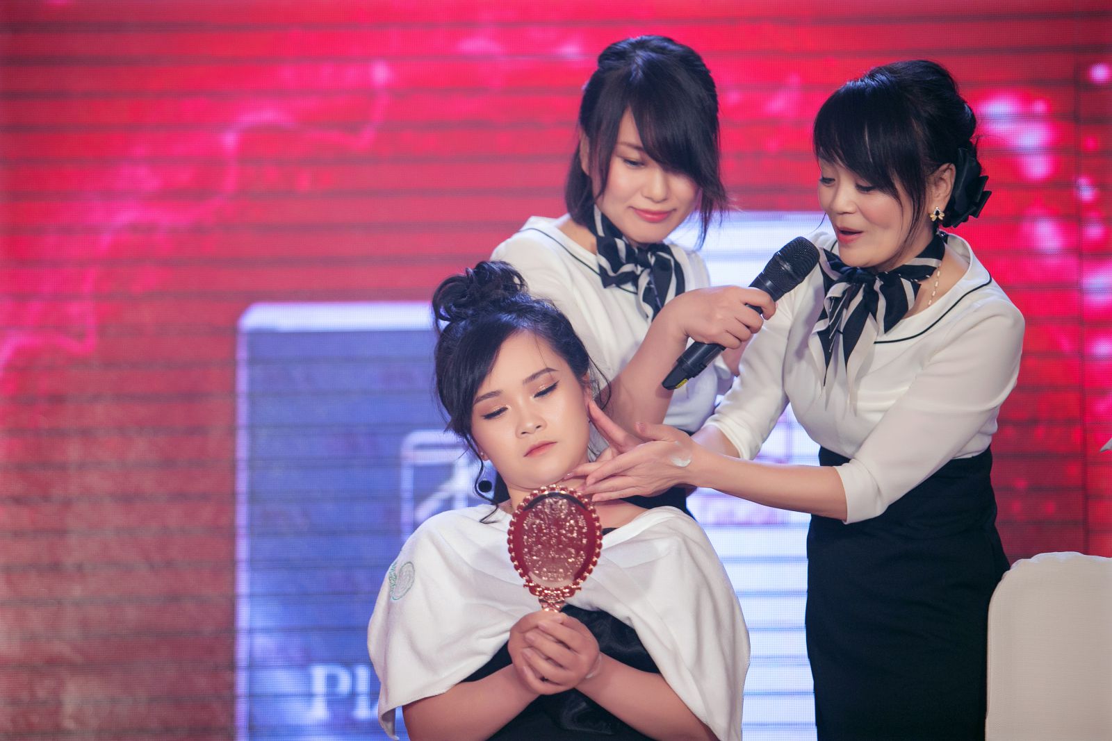 Là người trực tiếp thực hiện thủ thuật bấm huyệt lừng danh của mình tại ngay sự kiện “Tỏa sáng sắc đẹp nữ vương”. Chỉ trong vỏn vẹn 5’ Cô Hara đã khiến khách mời đi từ ngạc nhiên này đến bất ngờ khác khi tận mắt chứng kiến sự thay đổi trên gương mặt của người mẫu. Cô Hara – 62 tuổi (từ phải qua) giáo sư đào tạo hàng đầu tại Nhật Bản thực hiện thủ thuật bấm huyệt nâng cơ mặt ngay trên sân khấu