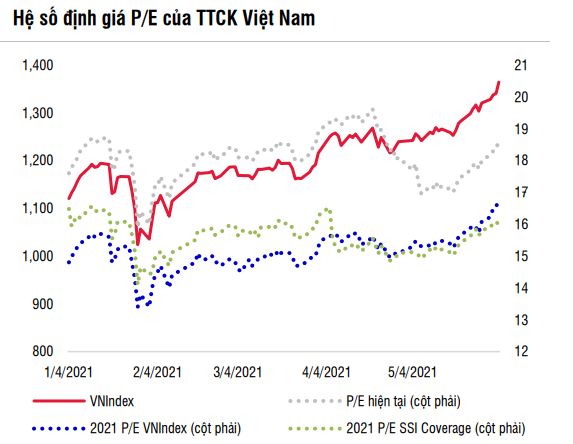 Như vậy, mặt bằng lãi suất tiền gửi thấp và hoạt động sản xuất tiếp tục đình trệ do Covid-19, sự hoạt động tích cực của nhà đầu tư cá nhân sẽ tiếp tục có lợi cho kênh chứng khoán khi lượng tiền lớn đổ vào TTCK thông qua các tài khoản cá nhân để tìm kiếm lợi nhuận. Định giá P/E hiện tại (trượt 4 quý gần nhất) và P/E ước tính năm 2021 vào ngày 03/6/2021 của VN-Index đã tăng lên tương ứng 18,6 lần và 16,8 lần từ mức 18,1 lần và 15,1 lần ở thời điểm cuối tháng 4; trong khi đó P/E năm 2021 của SSI Coverage (các cổ phiếu trong danh sách phân tích của SSI) hiện vào khoảng 16 lần. Tăng trưởng lợi nhuận các doanh nghiệp niêm yết trong quý II/2021 dự kiến vẫn ở mức cao, do nền so sánh thấp cùng kỳ năm ngoái sẽ tiếp tục đưa mức P/E trượt 4 quý gần nhất về mức hấp dẫn hơn. Cùng với đó, xu hướng tăng vốn ở các nhóm ngành có vốn hóa lớn nhất là Ngân hàng và Bất động sản, bên cạnh động thái tương tự của các công ty chứng khoán giúp mở rộng dư địa cho vay ký quỹ sẽ là các chất xúc tác quan trọng giúp thị trường vượt qua các nhịp biến động ngắn hạn và tiếp tục đi lên.