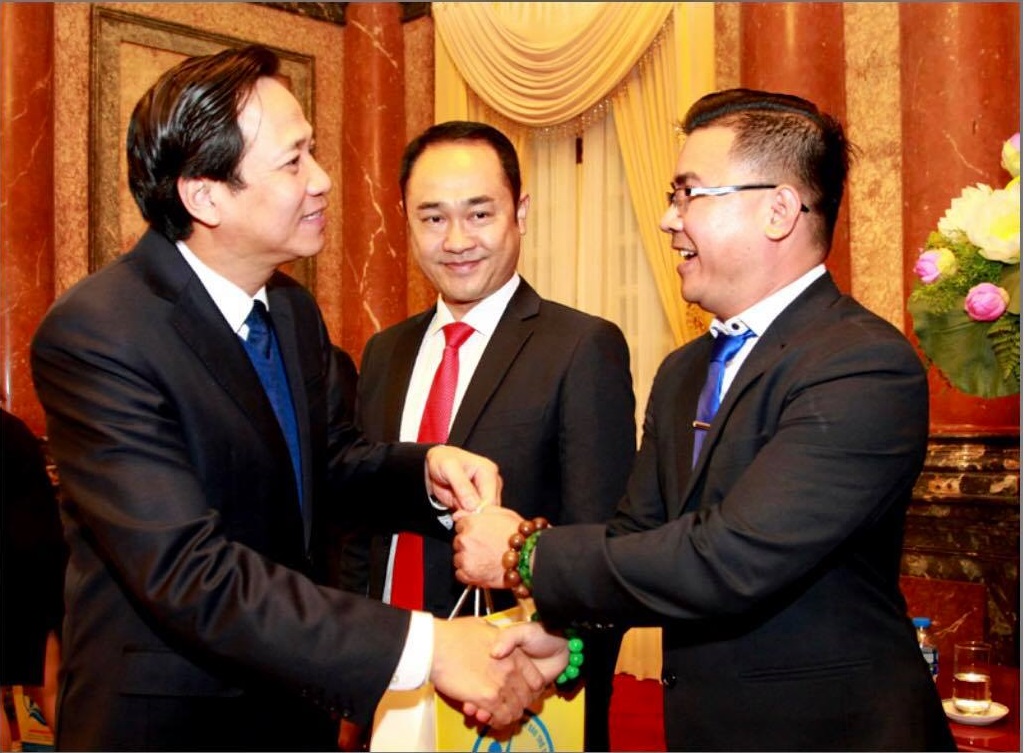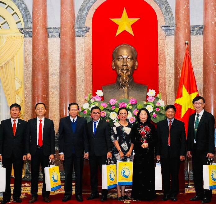 Ông Đinh Trọng Vỹ người sáng lập ra HTKNYT chụp hình lưu niệm cùng PCT Nước bà Đặng Thị Ngọc Thịnh và Ông Đào Ngọc Dung Bộ Trưởng Bộ Lao Động Thương Binh và Xã Hội