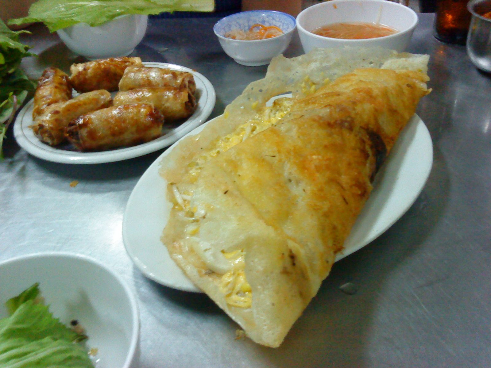 Bánh xèo được làm từ bột gạo, nước, bột nghệ (khiến chiếc bánh có màu vàng ươm quyến rũ), sữa dừa kết hợp thành bột nhão, nhồi nhân bằng thịt lợn béo ngậy,tôm, giá đỗ rồi cho vào áp chảo. Miếng bánh giòn tan, ăn kèm rau sống, chấm nước mắm chua ngọt, thơm ngon mà không bị ngấy.