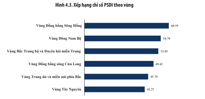 Ngoài ra, nếu xét theo vùng, PSDI có sự chênh lệch nhất định. Kết quả xếp hạng PSDI theo vùng cho thấy có sự phân nhóm rõ nét giữa 6 vùng kinh tế - xã hội trong cả nước.