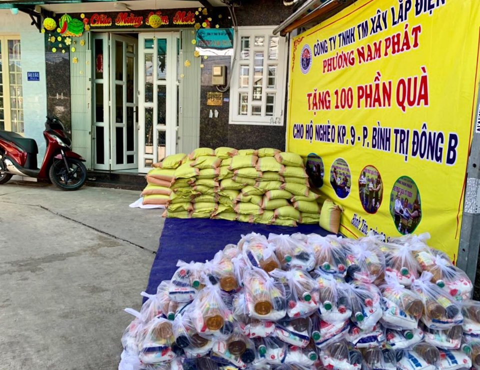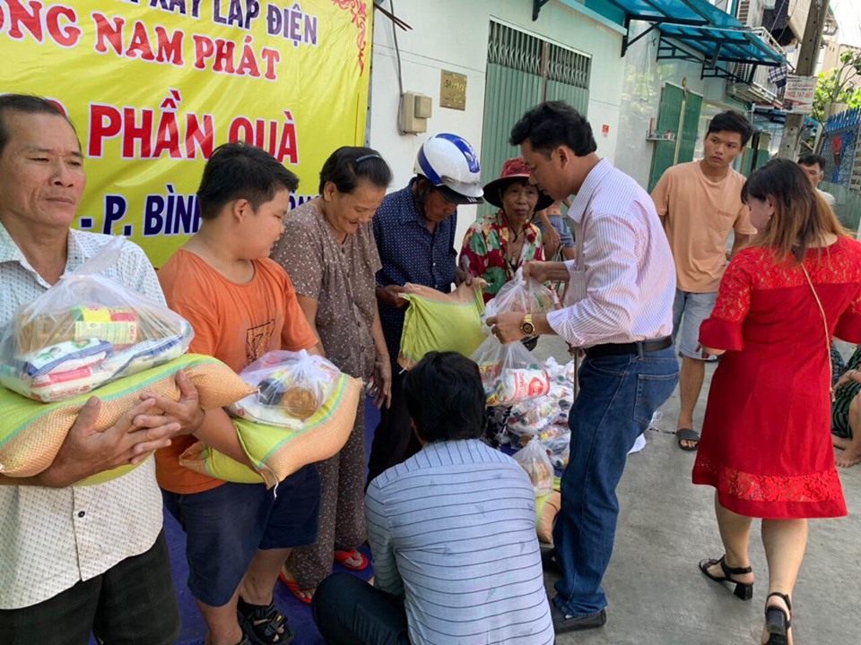 Ông Thái Thanh Tuấn- Phó giám đốc Công ty TNHH Thương Mại Xây Lắp Điện Phương Nam Phát soạn những phần quà để trao cho bà con tại khu phố