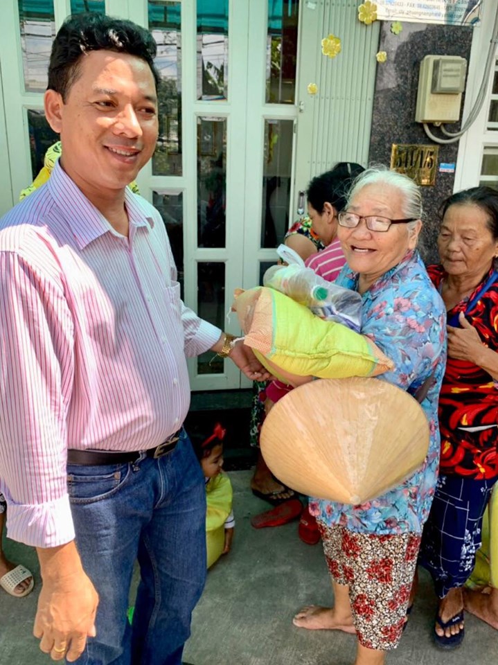 Ông Phạm Hồng Lê - Giám đốc Công ty TNHH Thương Mại Xây Lắp Điện Phương Nam Phát trao quà cho bà con nghèo tại địa phương