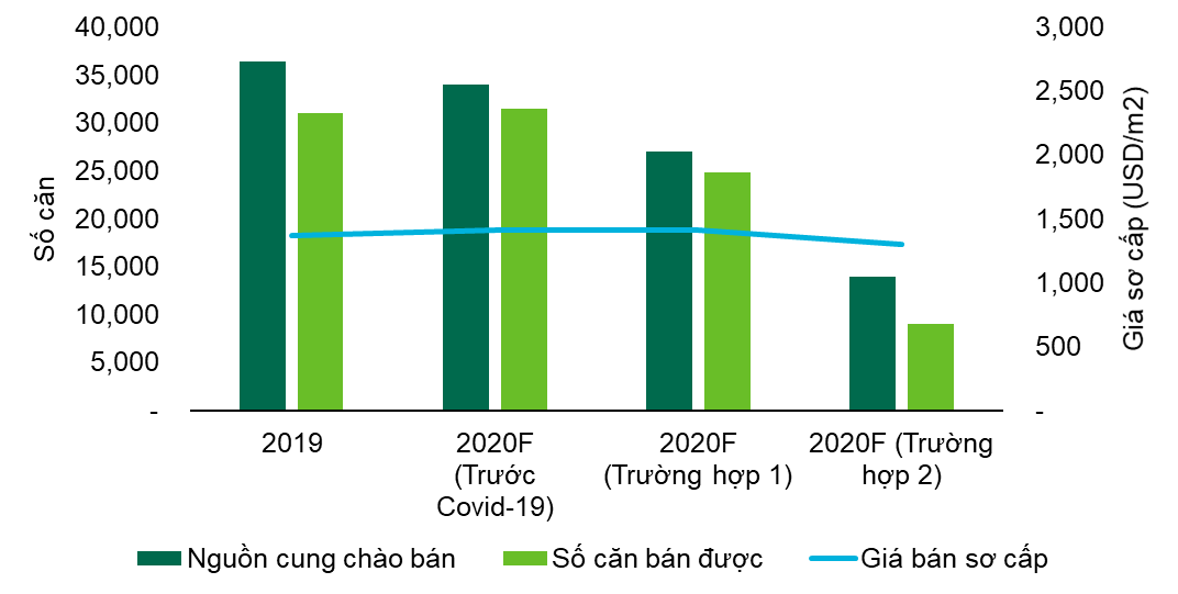 Trong tình huống xấu hơn, dịch bệnh không được kiểm soát trước khi kết thúc quý III/2020, số căn mở bán mới và doanh số bán dự kiến sẽ lần lượt giảm xuống khoảng 14.000 căn và 9.000 căn, chỉ bằng 30%–40% lượng mở bán và doanh số của năm 2019. Giá bán sơ cấp dự kiến sẽ giảm xuống khoảng 1.300 USD/m2, giảm 6% theo năm khi mà các dự án cao cấp có thể trì hoãn thời điểm mở bán sang năm năm 2021 và các dự án hiện hữu phải đưa ra chính sách giá cạnh tranh hơn để thu hút người mua.