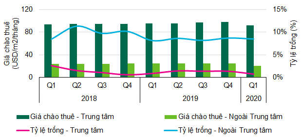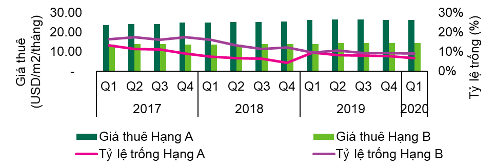 Đối với phân khúc văn phòng. Đây là phân khúc duy nhất chưa chịu sự ảnh hưởng từ dịch Covid 19. Trong quý I/2020, tổng nguồn cung văn phòng tại Hà Nội vào khoảng 1.380.000m2 NLA, không thay đổi so với qúy IV/2019, do không có dự án mới hoàn thành. Giá chào thuê của cả Hạng A và Hạng B duy trì ổn định so với quý trước, lần lượt ở mức 26,2USD và 14,3USD/m2/tháng (không bao gồm VAT và phí dịch vụ). Về tỷ lệ trống, cả hai Hạng đều duy trì ở mức tích cực dưới 10%. Tỷ lệ trống Hạng A đạt 6,4%, giảm 2,9 điểm phần trăm so với năm trước, trong khi tỷ lệ trống Hạng B giảm xuống 8,8%, giảm 0,5 điểm phần trăm so với năm trước.