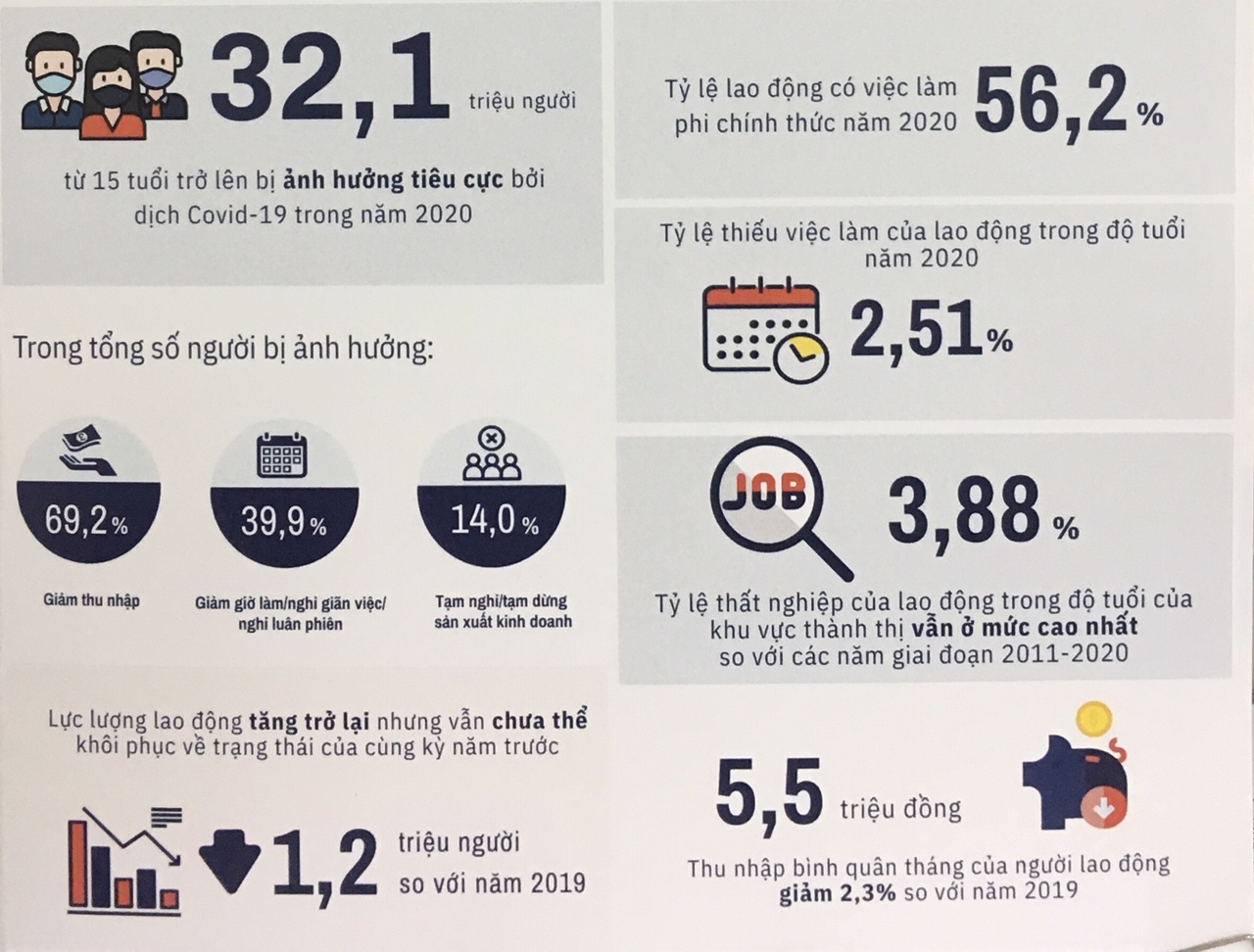 Tại buổi họp báo Tình hình lao động việc làm quý IV và năm 2020, ngày 6/1/2020, bà Vũ Thị Thu Thủy, Cục trưởng Cục Thu thập dữ liệu và ứng dụng công nghệ thông tin thống kê, Tổng cục Thống kê cho biết, tính đến tháng 12 năm 2020, cả nước có 32,1 triệu người từ 15 tuổi trở lên bị ảnh hưởng tiêu cực bởi dịch Covid-19 bao gồm người bị mất việc làm, phải nghỉ giãn việc/nghỉ luân phiên, giảm giờ làm, giảm thu nhập…
