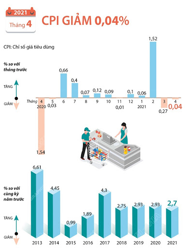 Tính riêng tháng 4/2021, giá lương thực, thực phẩm giảm do nguồn cung dồi dào; giá điện, nước sinh hoạt giảm theo nhu cầu tiêu dùng là những nguyên nhân chính làm chỉ số giá tiêu dùng (CPI) tháng 4/2021 giảm 0,04% so với tháng trước, tăng 1,27% so với tháng 12/2020. So với cùng kỳ năm trước, CPI tháng Tư tăng 2,7%; CPI bình quân 4 tháng đầu năm 2021 tăng 0,89%, mức tăng thấp nhất kể từ năm 2016; lạm phát cơ bản 4 tháng tăng 0,74%.