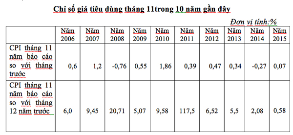 Theo dự báo của Trung tâm thông tin Công nghiệp và Thương mại (Bộ Công Thương) hồi cuối tháng 10/2015, dự báo cả năm, CPI sẽ dao động từ 1,5%-2%, thấp hơn từ 3-3,5 điểm phần trăm so với mục tiêu 5% năm nay và là mức thấp nhất trong 15 năm qua.