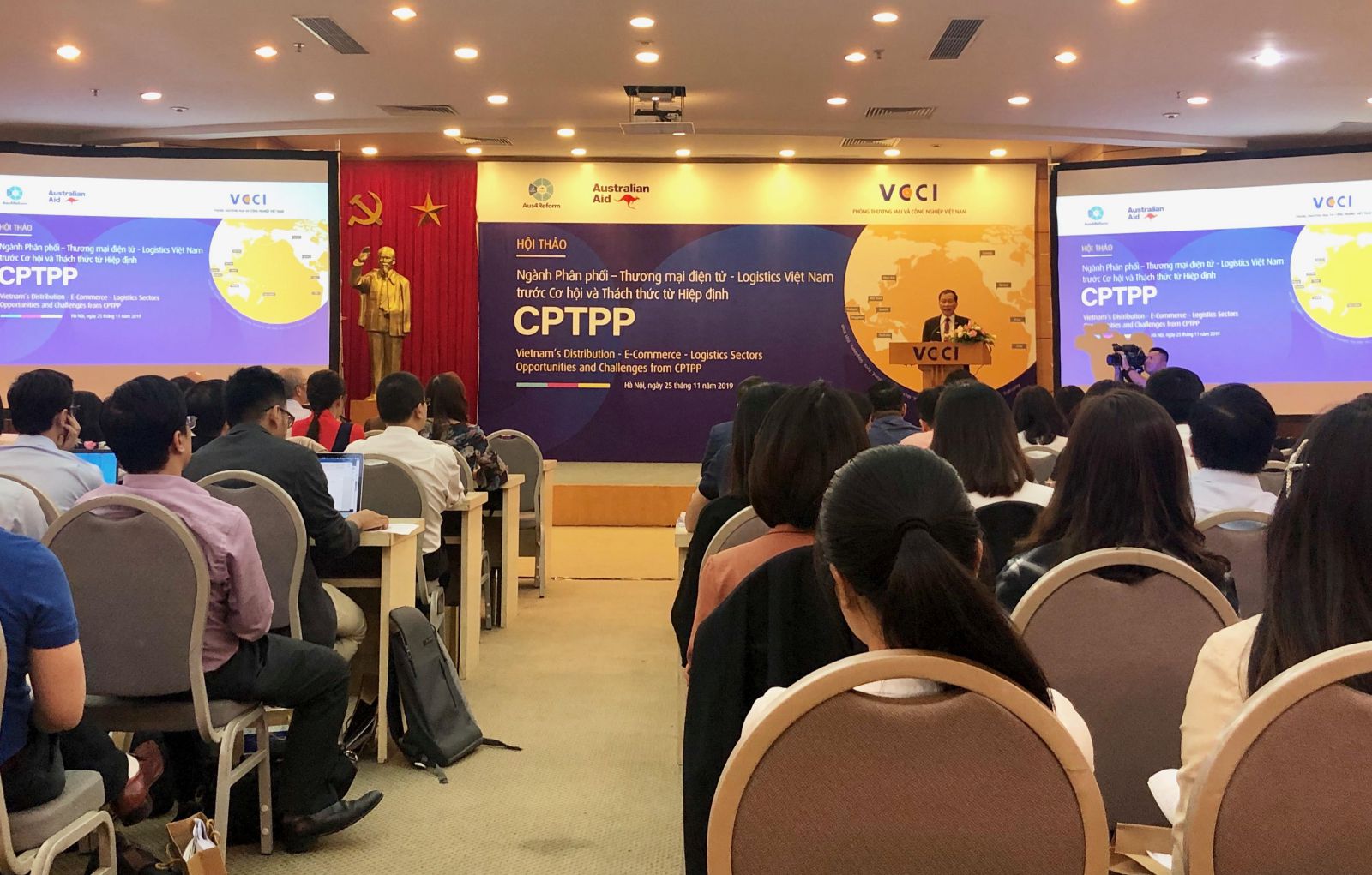 Trong khuôn khổ Chương trình Australia hỗ trợ cải cách kinh tế Việt Nam (Aus4Reform), chiều nay, Phòng Thương mại và Công nghiệp Việt Nam (VCCI) đã tổ chức Hội thảo Ngành Phân phối - Thương mại điện tử - Logistics Việt Nam trước cơ hội và thách thức từ Hiệp định CPTPP.