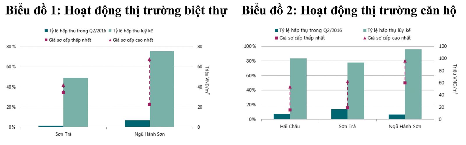 Cụ thể là, tại phân khúc biệt thự và căn hộ, tỷ lệ hấp thụ trong quý II/2016 tăng 7 điểm % lên mức 11% và tỷ lệ hấp thụ lũy kế tăng 2 điểm % lên mức 85%. Tỷ lệ hấp thụ trong quý của biệt thự tăng 1 điểm % lên mức 4% và tỷ lệ hấp thụ lũy kế tăng 1 điểm % lên mức 67%. Tại phân khúc này, giá sơ cấp căn hộ thấp nhất được ghi nhận tại quận Hải Châu (15 triệu đồng/m²), trong khi giá cao nhất được ghi nhận tại quận Ngũ Hành Sơn (69 triệu/m²). Giá sơ cấp biệt thự thấp nhất và cao nhất đều được ghi nhận tại quận Ngũ Hành Sơn ở mức lần lượt 22 triệu/m² và 54 triệu/m² (Biểu đồ 1, 2).