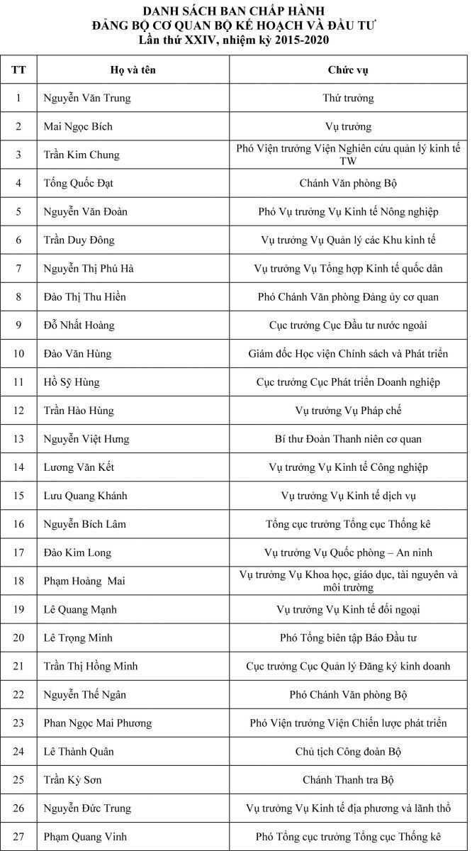 Tại Đại hội, bằng tinh thần và trách nhiệm cao, các đại biểu tham dự đã bầu 27 đồng chí vào Ban Chấp hành Đảng bộ Bộ Kế hoạch và Đầu tư Khoá XXIV, nhiệm kỳ 2015-2020 với số phiếu tập trung.