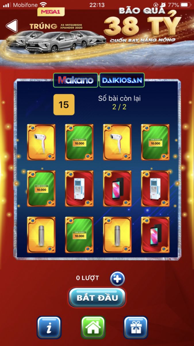 Chơi và Nhận giải: 100% tham gia đều trúng thưởng, mỗi khách hàng của Đại Việt tham gia chương trình khuyến mãi hoàn toàn có thể nhận về các quà tặng giá trị cao như 12 xe ô tô Mitsubishi, 4.5000 máy làm mát Nakami, 5.700 điện thoại V-smart, 25.000 bình giữ nhiệt, 70.000 thẻ cào điện thoại. Và rất nhiều phần quà hấp dẫn khác.