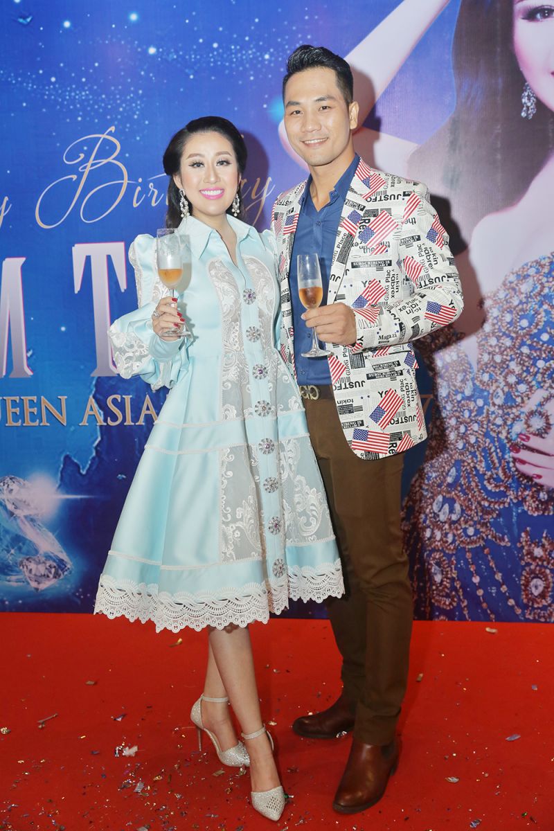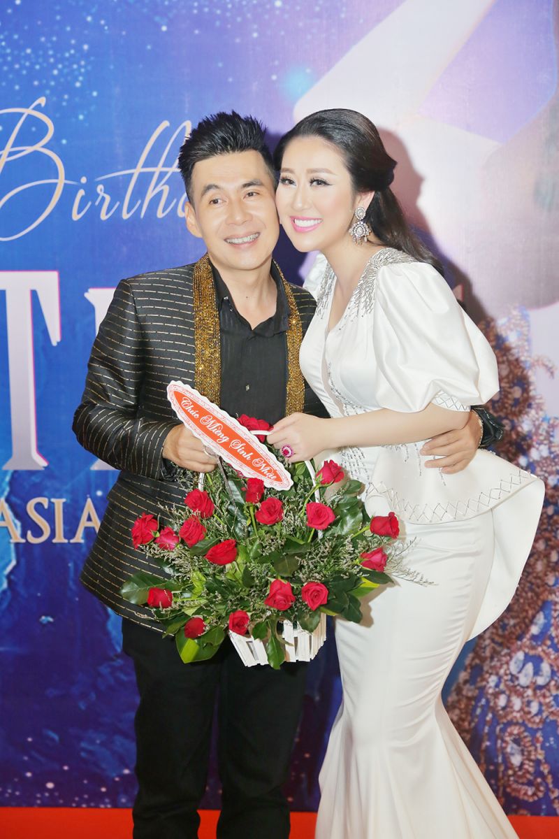 Nữ chủ nhân buổi tiệc khoe nét đẹp rạng rỡ bên MC Anh Quân giản dị với trang phục thun và phong cách phong trần của Á quân Quốc tế Hoàng Phi Kha.