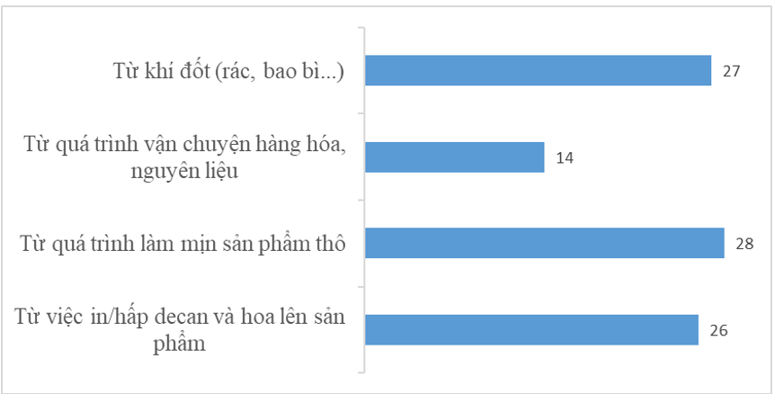 Kết quả cho thấy, công đoạn mài, chà nhám sản phẩm gốm được 28/50 người (56 %) lựa chọn là nguồn ô nhiễm không khí đáng lo ngại nhất. Đứng thứ hai là hoạt động đốt rác, đốt bao bì với 27/50 phiếu (54 %), cho thấy tập quán đốt rác thải tại chỗ cũng đóng góp đáng kể vào ô nhiễm không khí. Tiếp theo, công đoạn in/hấp decal trên sản phẩm được 26/50 người (52 %) đánh giá gây ảnh hưởng xấu (do quá trình này sử dụng hóa chất và nhiệt sinh ra mùi, khí thải). Ngược lại, quá trình vận chuyển chỉ có 14/50 phiếu (28 %) cho là đáng lo ngại, được xem là nguồn ô nhiễm ít ảnh hưởng nhất. Kết quả này giúp khoanh vùng những hoạt động ưu tiên cần kiểm soát (như khâu mài sản phẩm và đốt rác) nhằm giảm thiểu ô nhiễm không khí tại Bát Tràng.