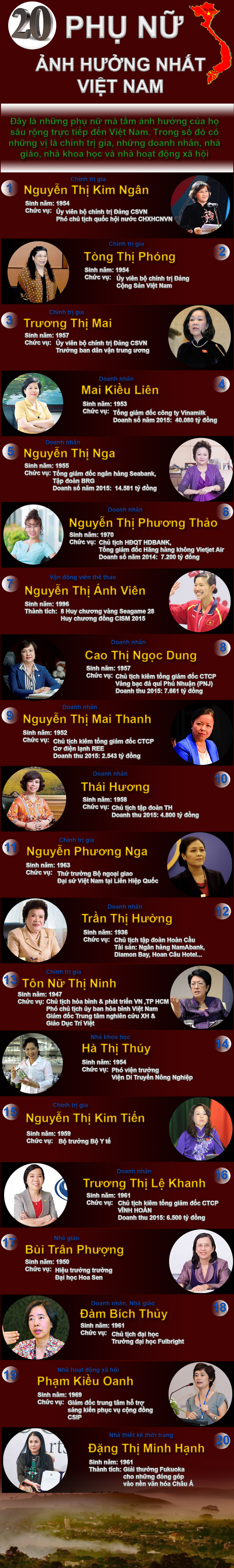 Sau đây là danh sách 20 phụ nữ có ảnh hưởng nhất Việt Nam, báo Công an TP.HCM đồ họa chuyển đến bạn đọc dựa trên dữ liệu của Forbes: