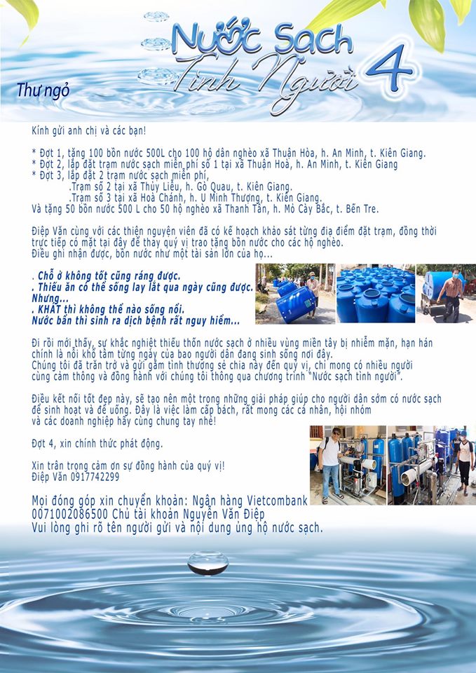 Trước tình cảnh này, cũng như một số nghệ sĩ khác, Đạo diễn Điệp Văn - Người được biết qua chương trình xây nhà cho người nghèo “100 ngàn - Vạn mái ấm” mà anh sáng lập, đã không thể đứng ngoài cuộc. Biết tình trạng thiếu nước đang là nỗi khổ người dân, anh quyết định hành trình khảo sát thực tế tại một số vùng miền tây, đặc biệt là Kiên Giang. Sau chuyến đi, anh nhận ra đây là việc làm cấp thiết để cứu bà con ở những vùng hạn hán, nhiễm mặn, không có nước để sinh hoạt và không có nước sạch để uống.