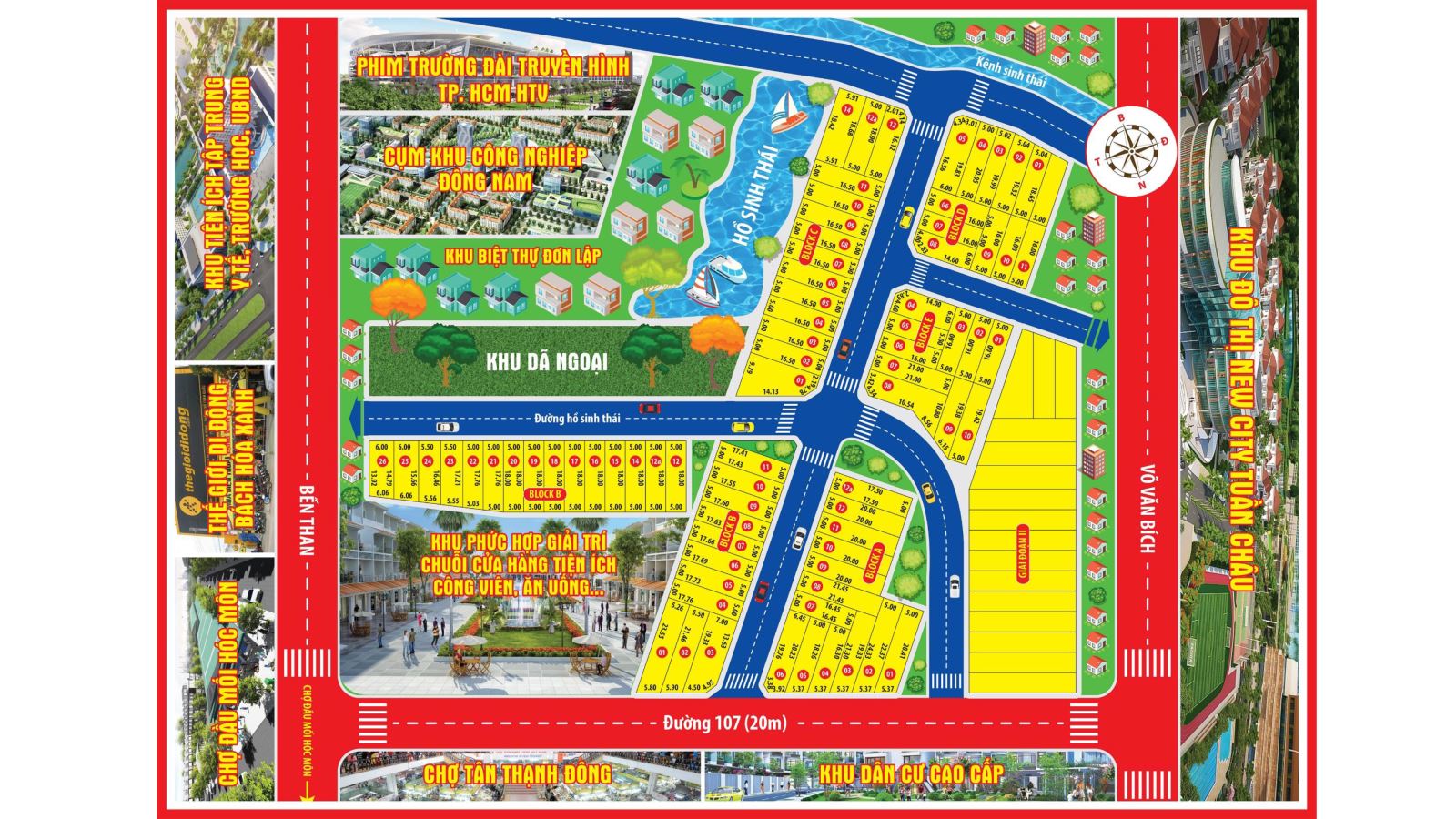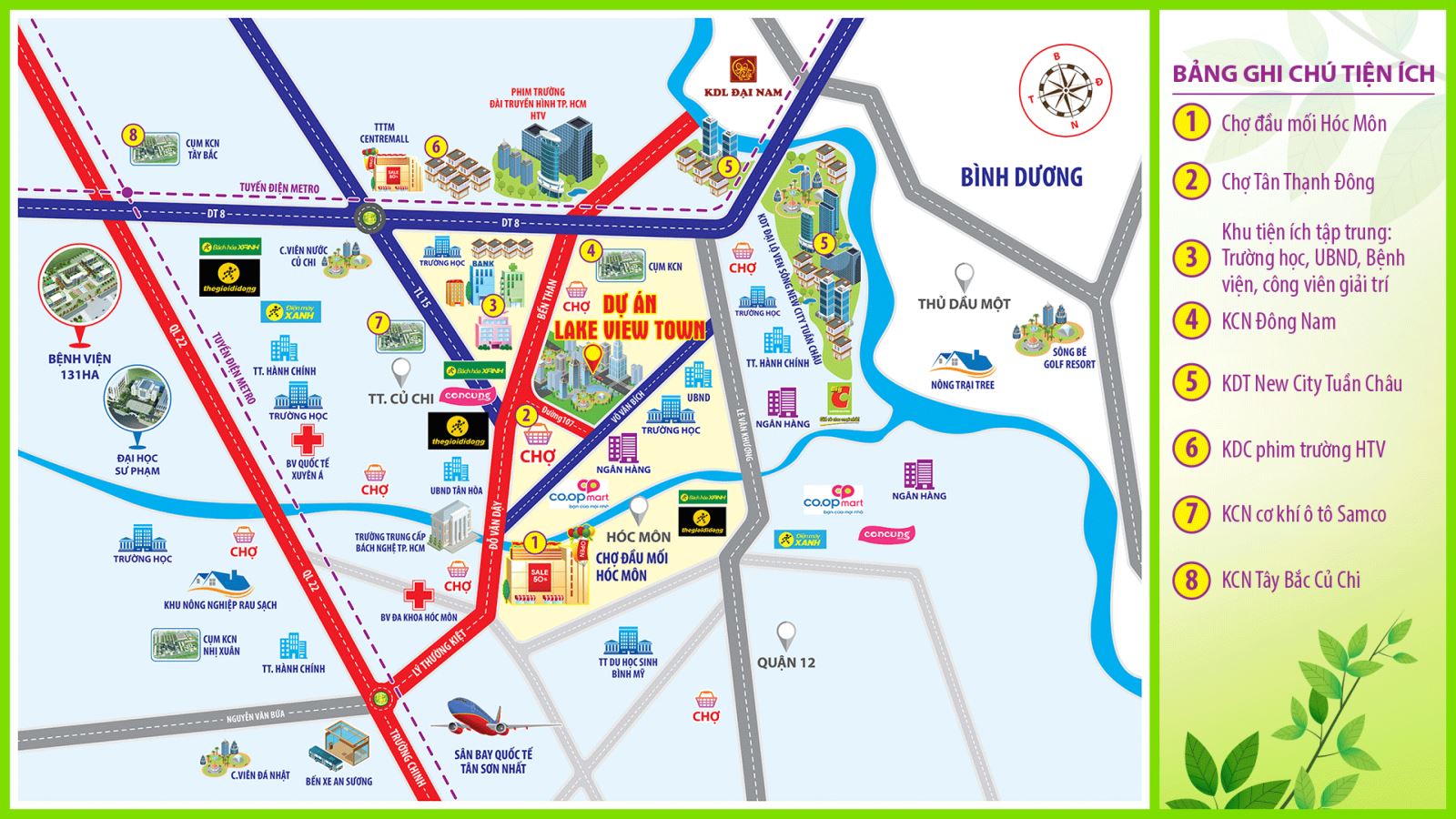 Toạ lạc tại cung đường 107 kết nối với Bến Than và Vỏ Văn Bích xã Tân Thạnh Đông, ngay trung tâm chợ Sáng Tân Thạnh Đông, liền kề với chợ đầu mối Hóc Môn, giáp với khu công nghiệp cơ khí ô tô Samco, KCN Đông Nam huyện Củ Chi, liên kết vùng tại khu dân cư Lake View Town thuận lợi, nhanh chóng khi liền kề các tuyến đường như đường Vành Đai 3, đường Xuyên Á, tỉnh lộ 15… Dễ dàng kết nối đến các quận huyện TP.HCM như Hóc Môn, Q.12, quận Tân Bình, quận Gò Vấp, quận Tân Phú… Với các tỉnh Đông Nam Bộ (Tây Ninh, Bình Dương) thuận tiện cho các hoạt động giao dịch, thương mại…
