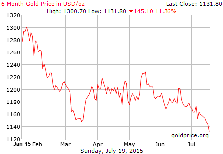 So với mức đỉnh của giá vàng 1.294 USD/ounce hồi đầu tháng 01/2015 thì giá vàng đã tụt đến 11,5% khi về mức 1.145 USD/ounce (ngày16/7/2015). Quan sát diễn biến từ đầu năm tới nay, giá vàng thế giới rung lắc rất mạnh quanh khu vực giá 1.180 USD/ounce và hiện tại đã phá vỡ ngưỡng hỗ trợ 1.150 USD/ounce. Sáng ngày 20/7, giá vàng thế giới có thời điểm sụt 4,2% dưới sức ép của đồng USD mạnh. Giá vàng giao ngay tại thị trường châu Á đứng ở 1.108 USD/oz, giảm 26,3 USD/oz so với đóng cửa cuối tuần trước ở