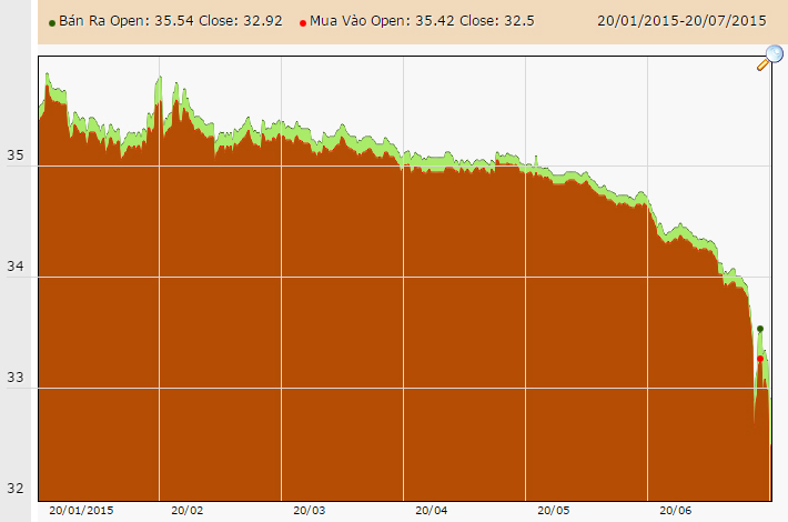 Chưa bao giờ niềm tin vào vàng lại suy giảm như hiện nay. Đồng hành với giá thế giới, giá vàng trong nước cũng liên tục lao dốc. So với mức ổn định trên 35 triệu/lượng cuối tháng trước, giá vàng trong nước ngày 16/7 đã trượt dốc về mức 32,67 – 32,87 triệu/lượng, tức là đã mất giá tới hơn 2 triệu/lượng. Sáng 20/7, giá vàng trong nước giảm cầm chừng, Công ty Vàng bạc đá quý SJC báo giá vàng miếng cùng thương hiệu ở mức 32,6 triệu đồng/lượng và 33 triệu đồng/lượng, tương ứng giá mua và giá bán.