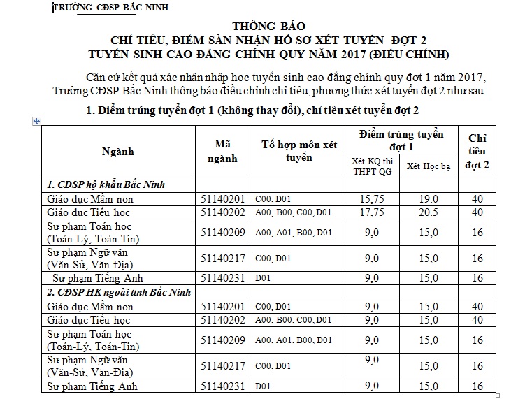 Trường Cao đẳng Sư phạm Bắc Ninh đưa ra mức điểm trúng tuyển các ngành: Sư phạm Toán, Sư phạm Sinh, Sư phạm Ngữ văn là 9 điểm