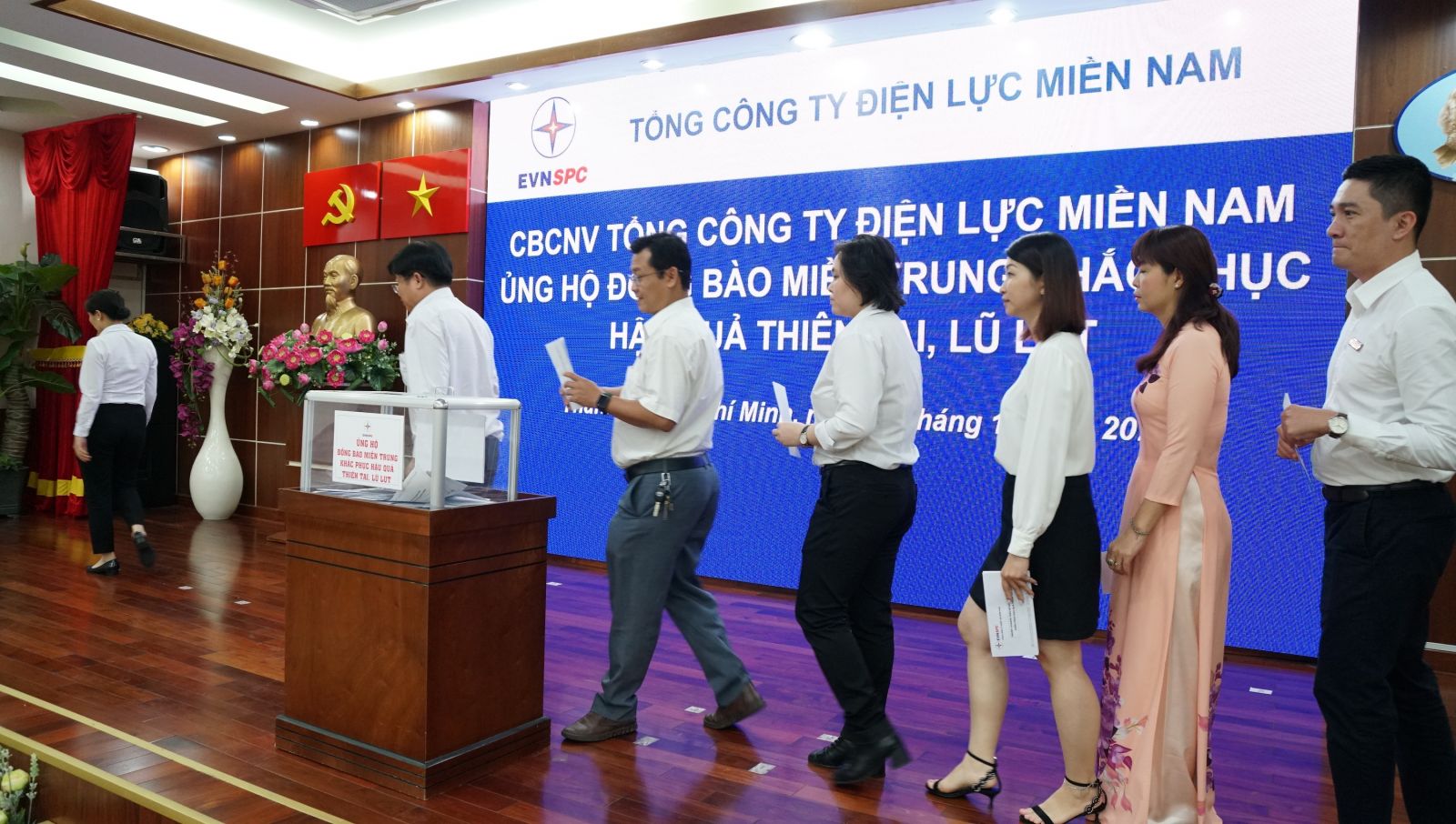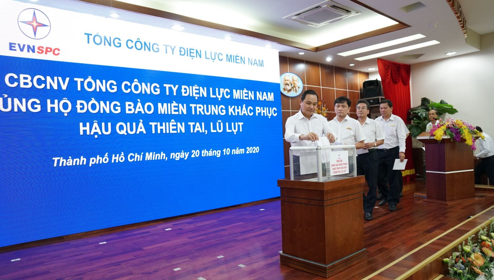 Chiều ngày 20-10, Tổng công ty Điện lực miền Nam (EVNSPC) đã phát động và tổ chức chương trình quyên góp ủng hộ đồng bào miền Trung khắc phục hậu quả do thiên tai, lũ lụt. Tham gia hưởng ứng, đóng góp trực tiếp tại buổi vận động quyên góp có Ông Nguyễn Văn Hợp – Bí Thư đảng ủy - CT HĐTV cùng toàn thể Ban lãnh đạo và CBCNVC người lao động Cơ quan Tổng công ty đã tham gia.
