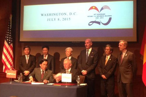 Chiều 8/7 giờ địa phương, tức sáng 9/7 giờ Hà Nội, tại Trụ sở Phòng Thương mại Hoa Kỳ ở thủ đô Washington D.C., Tổng Bí thư Nguyễn Phú Trọng đã chứng kiến lễ ký kết một số văn kiện hợp tác hai nước Việt-Hoa Kỳ.