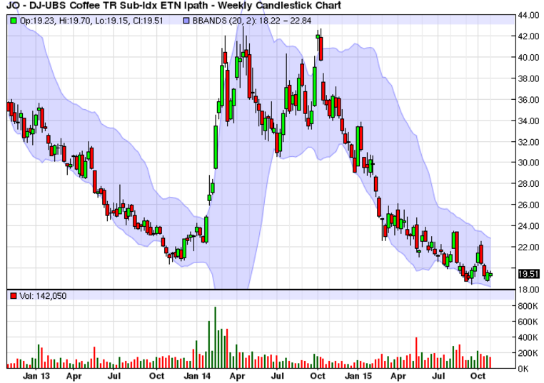 Kể từ khi nguồn cung cà phê được chi phối bởi các nước sản xuất tại các thị trường mới nổi như Brazil và Việt Nam, tính biến động và lợi nhuận tiềm năng từ thị trường này khiến cho giao dịch cà phê trở nên rất hấp dẫn đối với nhà đầu tư và giới thương nhân. Nhờ vào sự phát triển của ngành đầu tư chỉ số tín thác (ETF), nhà đầu tư hiện nay có nhiều cách để đạt được lợi nhuận từ loại hàng hóa mềm này. Trong kênh đầu tư ETF cà phê, có hai công cụ chỉ số phổ biến nhất: trái phiếu chỉ số cà phê Dow Jones-UBS Coffee ETN (JO) với tổng vốn quản lý (AUM) hiện nay đạt 118,7 triệu USD và trái phiếu chỉ số cà phê Pure Beta Coffee ETN (CAFE) với AUM đạt 5,4 triệu USD./.