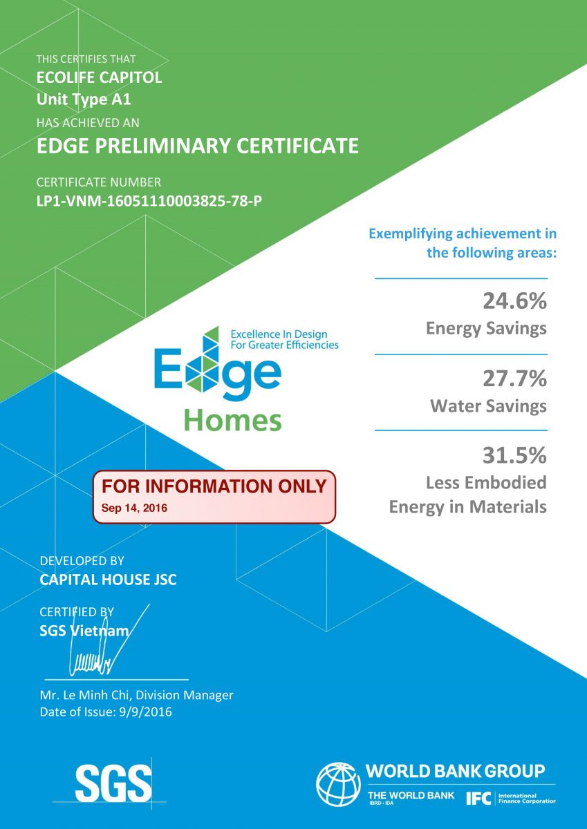 Tháng 06/2016, Capital House cùng SGS Việt Nam ký Hợp đồng tư vấn đánh giá chứng chỉ EDGE cho dự án EcoLife Capitol. Theo kết quả kiểm toán năng lượng, EcoLife Capitol tiết kiệm được 24,6% năng lượng, 27,7% nước và tiết kiệm năng lượng thông qua việc sử dụng vật liệu không nung, kính Low-e 2 lớp cách nhiệt… đạt tới 31,5%. Đặc biệt, việc lựa chọn giải pháp chống nóng cho những bức tường hướng Tây được Capital House sử dụng cách nhiệt bằng xốp XPS kết hợp với thạch cao giúp tiết kiệm tới 5% năng lượng sử dụng để làm mát trong căn hộ so với trước khi áp dụng. Kết quả này thuyết phục IFC trao chứng chỉ xanh EDGE cho dự án EcoLife Capitol.