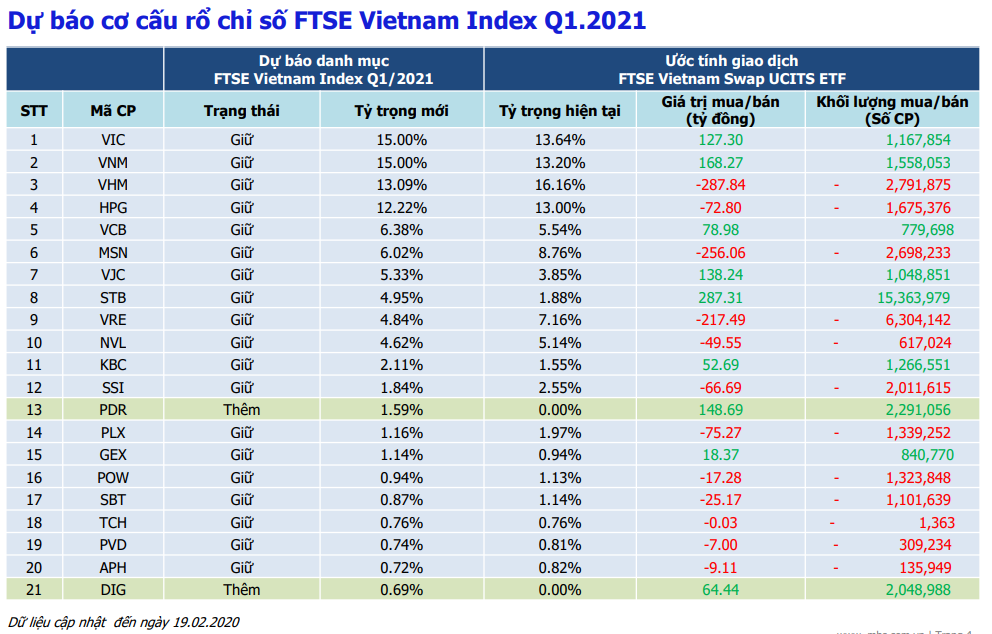 Danh mục chỉ số mới sẽ bắt đầu có hiệu lực từ ngày 19/03/2021. Dựa trên số liệu tổng hợp ngày 22/02/2021, MBS đưa ra ước tính: MVIS Vietnam Index có thể sẽ giữ nguyên các cổ phiếu Việt Nam hiện tại với tổng tỷ trọng cổ phiếu Việt Nam trong danh mục tăng từ 65,59% lên 67,83%. FTSE Vietnam Index có thể bổ sung thêm 2 mã cổ phiếu mới là PDR và DIG trong khi giữ nguyên các mã cổ phiếu trong danh mục hiện tại, nâng tổng số cổ phiếu trong danh mục lên 21 mã.