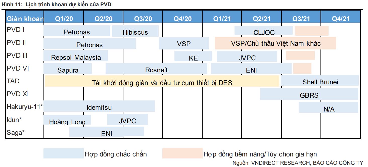 Các chuyên gia VNDIRECT cho rằng, giá mục tiêu của PVD cao hơn là 26.600 đồng/cổ phiếu. Theo đó, rủi ro tăng giá là giá dầu cao hơn kỳ vọng. Rủi ro giảm giá đến từ hiệu suất sử dụng giàn tự nâng thấp hơn dự kiến, và giá dầu thấp hơn kỳ vọng có thể cản trở các hoạt động E&P của Công ty.