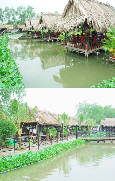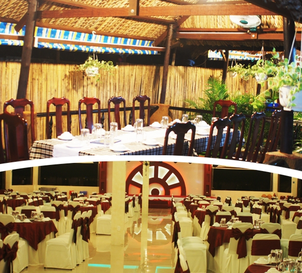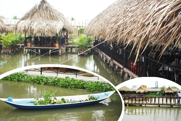 Bao quanh nhà hàng là hàng chuỗi các chòi lá mát mẻ nổi trên mặt hồ và những không gian bàn tiệc bên bờ hồ vừa dân dã vừa gần gũi. Thực khách có thể ngồi trên chòi, nhìn ngắm mặt hồ với bèo xanh, những đàn cá tung tăng và những cơn sóng gợn nhẹ.