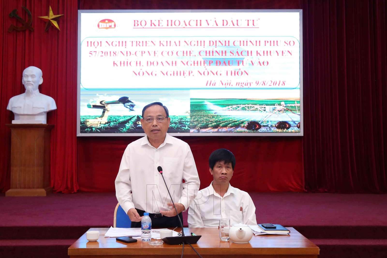 Ngày 09/8/2017, Bộ Kế hoạch và Đầu tư đã tổ chức Hội nghị triển khai Nghị định số 57/2018/NĐ-CP Chính phủ về cơ chế, chính sách khuyến khích, doanh nghiệp đầu tư vào nông nghiệp, nông thôn. Thứ trưởng Nguyễn Văn Hiếu chủ trì Hội nghị. Tham dự Hội nghị có 130 đại biểu đến từ các bộ, ban, ngành, địa phương và doanh nghiệp.