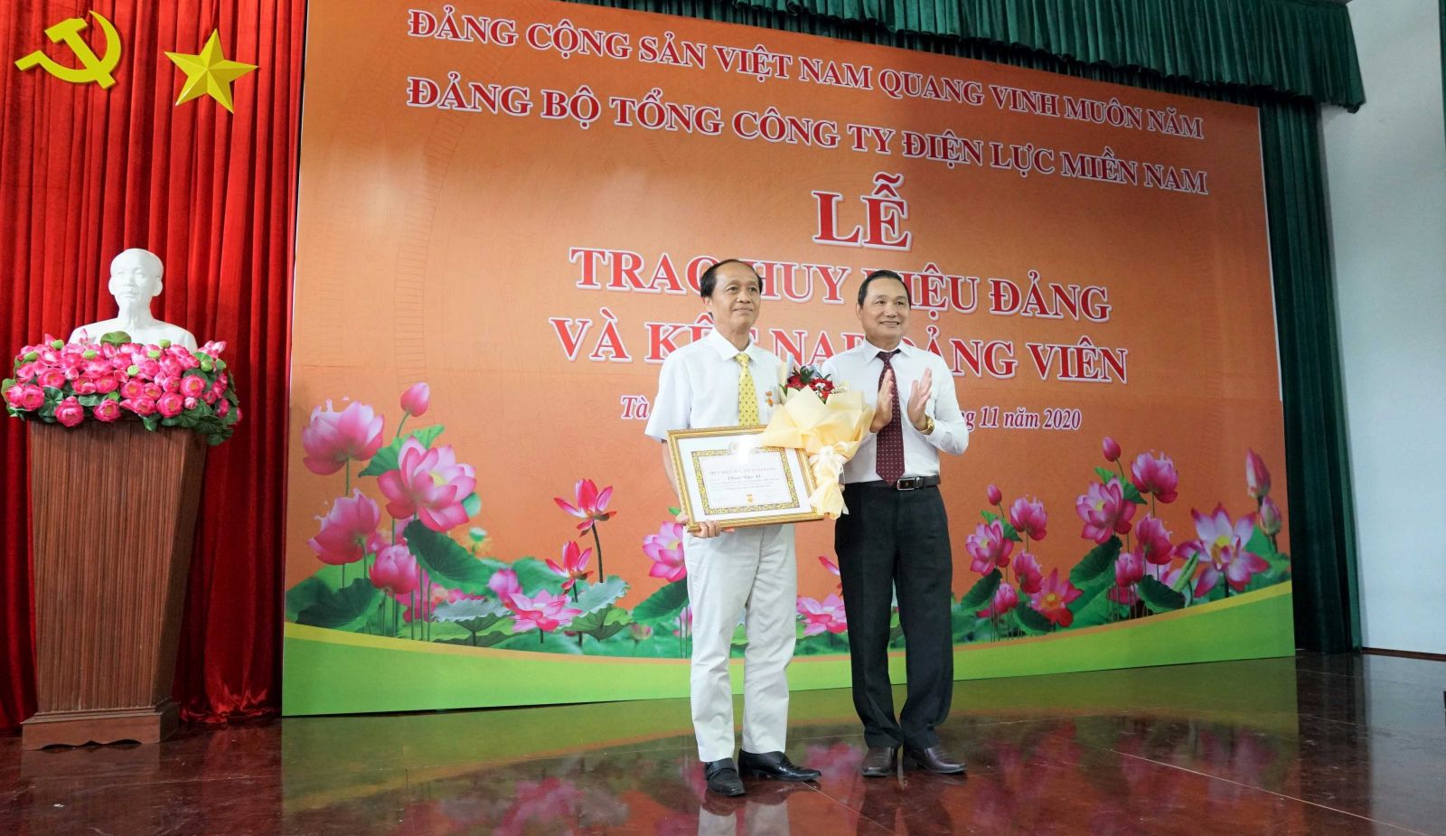 Thay mặt Đảng ủy khối cơ sở Bộ Công Thương tại TP.HCM, Bí thư Đảng ủy EVNSPC Nguyễn Văn Hợp trao huy hiệu 30 năm tuổi đảng cho đồng chí Phạm Ngọc Lễ