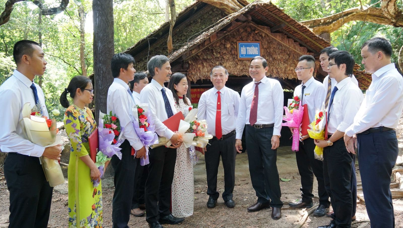 Bí thư Đảng ủy EVNSPC Nguyễn Văn Hợp và lãnh đạo đơn vị trò chuyện, căn dặn các đảng viên mới của Đảng bộ tại Hội trường Bộ Chỉ huy Quân giải phóng miền Nam Việt Nam