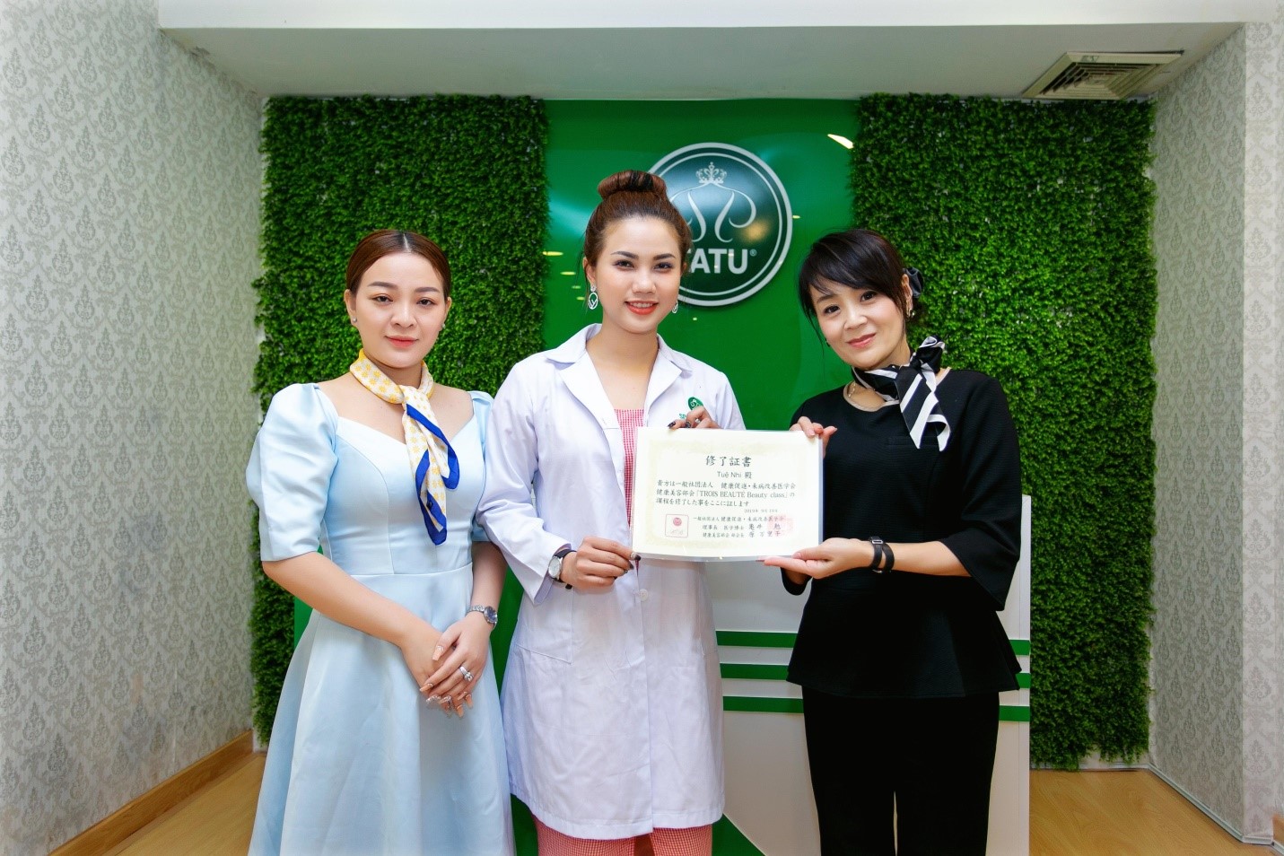 Tuệ Nhi nhận bằng chứng nhận hoàn thành khóa bấm huyệt tạo cằm Vline Nhật Bản tại Spa Tatu
