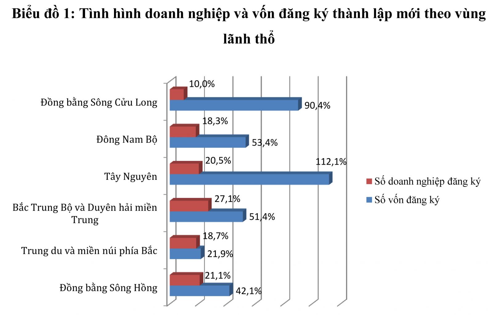 Theo vùng lãnh thổ, số doanh nghiệp đăng ký thành lập mới trong 8 tháng đầu năm 2016 đều tăng ở tất cả các vùng, trong đó, Trung Bộ và Duyên hải miền Trung có tỷ lệ tăng nhiều nhất (Biểu đồ 1).