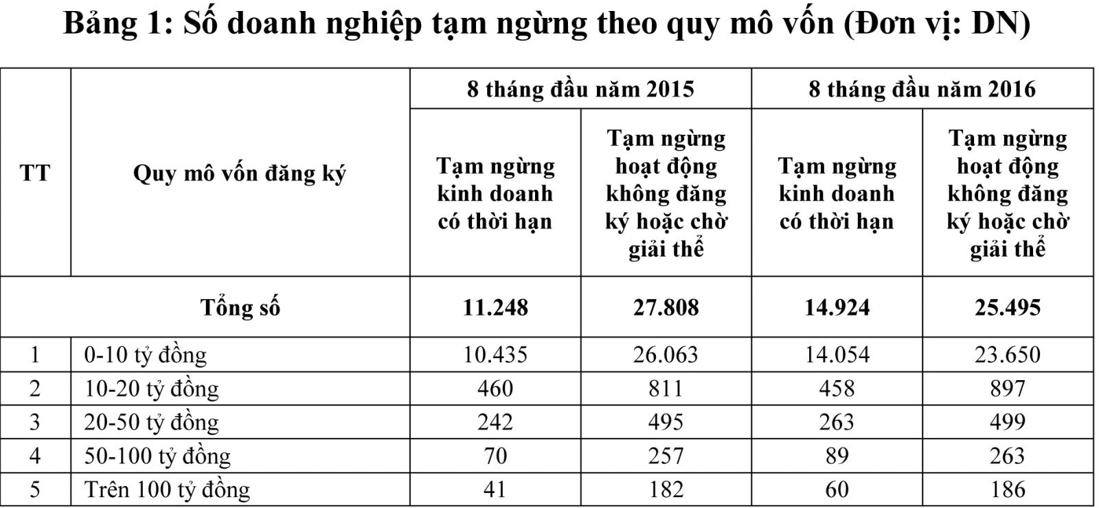 Thống kê cho thấy, số lượng doanh nghiệp tạm ngừng hoạt động không đăng ký hoặc chờ giải thể phần lớn là những doanh nghiệp có quy mô vốn đăng ký dưới 10 tỷ đồng, chiếm 93,0% trên tổng số doanh nghiệp tạm ngừng hoạt động không đăng ký hoặc chờ giải thể. So sánh với cùng kỳ của năm 2015 thì số doanh nghiệp tạm ngừng hoạt động có quy mô vốn đăng ký dưới 10 tỷ giảm 9,3% (Bảng 1).